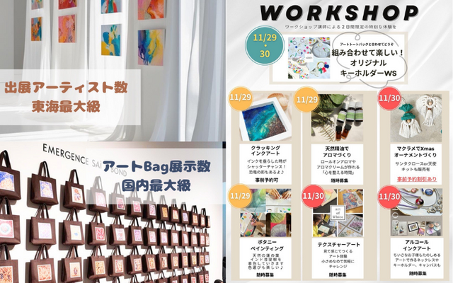 東海最大級の絵画展示に加え、アーティストたちによるデザイントートバッグは国内最大級。子どもから大人まで楽しめる、多彩なコンテンツが勢ぞろいです。