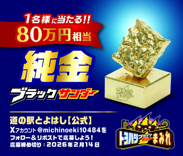 豊橋市がブラックサンダーにまみれることを記念して、80万円相当の純金ブラックサンダーの置物が当たるフォロー&リポストキャンペーンをX(旧Twitter)にて開催。道の駅とよはしのXアカウントをフォローし、リポストするだけで簡単応募!