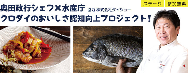 奥田政行シェフと水産庁の職員がクロダイの美味しさを伝えるステージと、奥田政行シェフ監修の「クロダイのイタリア風南蛮漬け」をさかな文化祭で限定販売!