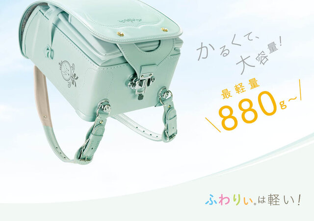 ふわりぃランドセル最大の特徴は「軽さ」です。発売以来軽量化にこだわり商品開発を行ってきました。背中まわりの出っ張りをスッキリさせた「コンパクトワイド」製法で880gの軽量化を実現させました。軽量さと丈夫さを両立した特殊設計です。