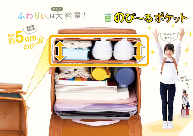 人気機能の最大5cm伸びる拡張型ポケット。荷物が多いときは全部広げて、たくさんの荷物を入れることができます。両手が空くので、安心・安全・らくらく通学ができます。