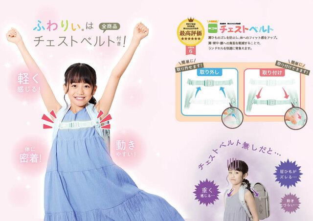 ふわりぃランドセルならではの特徴的な機能である「チェストベルト」は全商品に標準装備されています。ランドセルを背負った際、チェストベルトを使用する事で肩ひものズレを防止し、体へのフィット感をアップ。更に肩、背中、腰への負担が軽減され、快適に背負う事ができます。