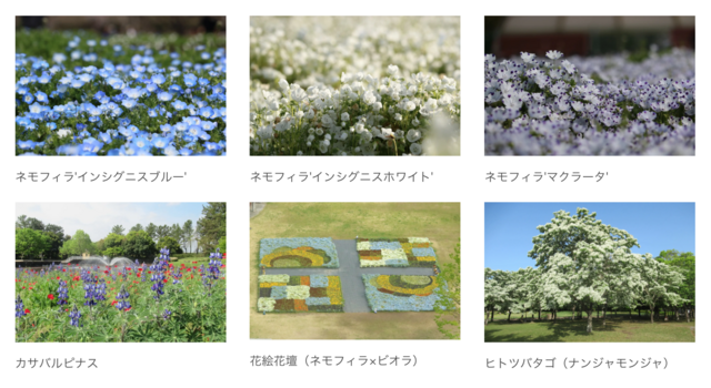 さわやかな水色のネモフィラ'インシグニスブルー'をはじめ、シャーレーポピー、カサバルピナスなど、春風に揺れる色とりどりの花々を楽しめます。